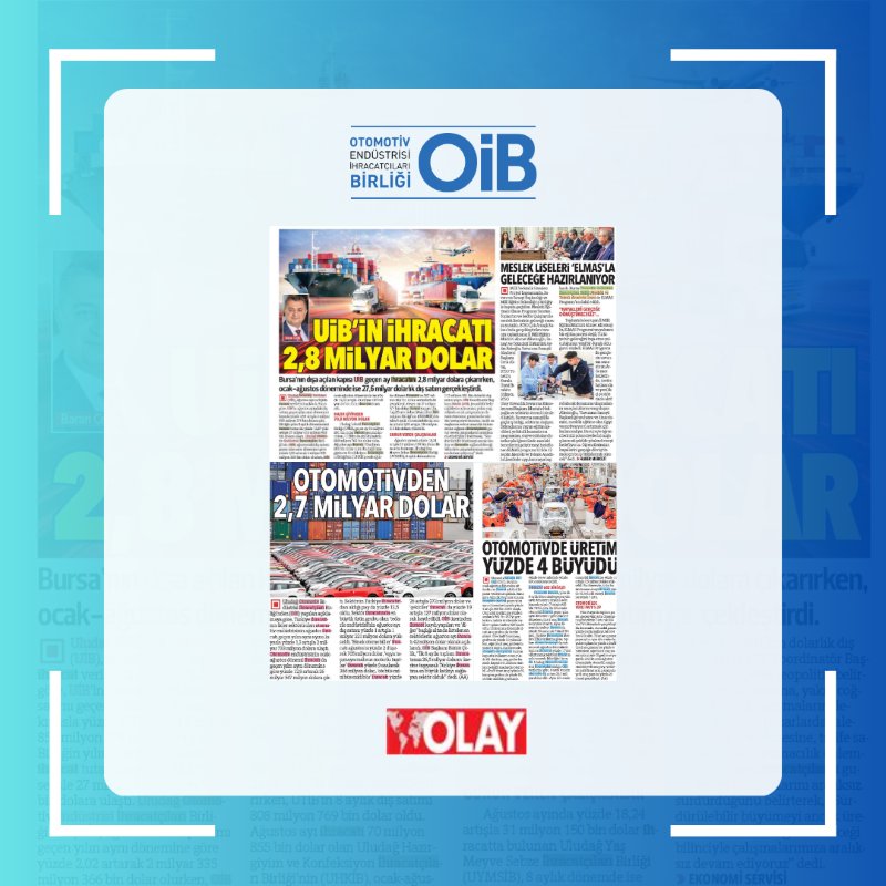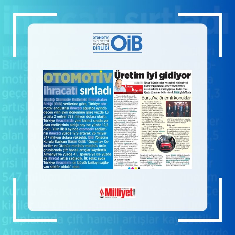Uludağ Otomotiv Endüstrisi İhracatçıları Birliği (OİB) verilerine göre, Türkiye otomotiv endüstrisi ihracatı eylülde geçen senenin aynı dönemine göre yüzde 7,7 artışla 3 milyar 661 milyon dolar oldu. Türkiye ihracatında birinci sırada yer alan endüstrinin aldığı pay ise yüzde 16,2 olarak gerçekleşti. Yılın ilk dokuz ayında otomotiv endüstrisi ihracatı geçen senenin aynı dönemine göre yüzde 12 artarak 30 milyar 205 milyon dolar oldu.