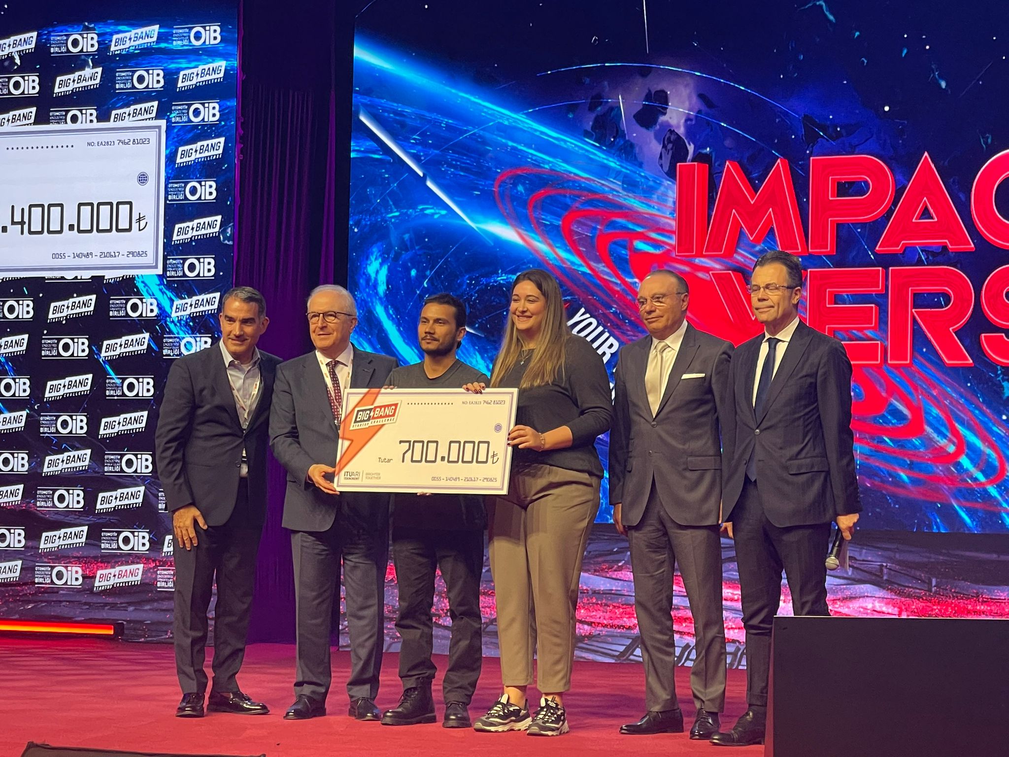 Big Bang Startup Challenge'da OİB adına sahnede ödülleri OİB Yönetim Kurulu Başkan Yardımcısı Yüksel Öztürk, OİB Yönetim Kurulu Üyeleri Onur Sarıkaya, OİB Denetim Kurulu Üyesi Ali İhsan Yeşilova ile OİB Denetim Kurulu Üyesi ve OGTY Yürütme Kurulu Başkanı Ömer Burhanoğlu birlikte açıklayarak takdim ettiler.